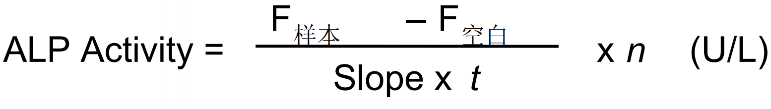 4. 计算:根据每个标准在20分钟时测量的荧光值,绘制曲线确定斜率。 样品的 ALP 活性为: