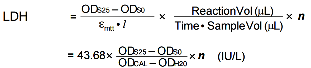 ODS25和ODS0分别是25分钟和0分钟时读取的样品OD565nm值。emtt 是还原型MTT的摩尔吸光系数。l是根据校准溶液计算得出的光程长度。ODCAL和ODH20分别是校准液和水的OD565nm值。反应体积和样品体积分别是200 mL和10 mL。n 是稀释系数。单位定义:1个单位(U)的LDH在pH 8.2下每分钟可催化1 mmole乳酸盐转化成丙酮酸盐。