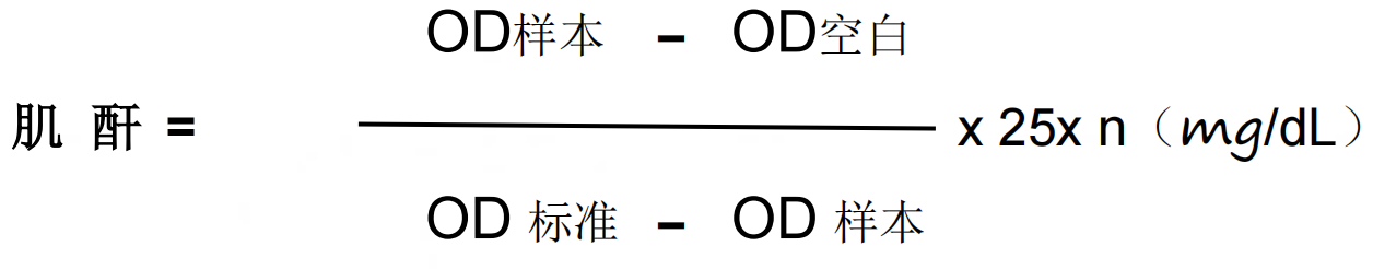 3. 在室温下孵育10分钟,然后在530 nm读取吸光度。注意:如果特定样品的OD标准-OD样本低于0.1,用等体积的水稀释样品并重复测定。将结果乘以稀释倍数。低标准信号是由于与尿液中其他分子的干扰,稀释度会降低干扰可以正确测量肌酐。