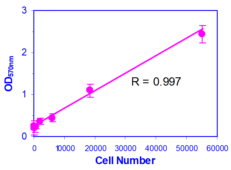本检测是基于具有代谢活性的细胞能将MTT转化为紫色甲臜的原理。对大多数细胞而言,完成这种还原反应需要3至5小时。将反应产物甲臜进行增溶处理,然后用吸光度分析仪定量测定所产生的有色溶液。酚红不会干扰检测结果。技术要点中的所有数据都是在含有酚红的培养基中测得的。
