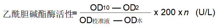 OD10和OD2分别代表样品在10分钟和2分钟时的OD测值;OD校准液和OD水分别代表校准液和水在10分钟时的OD测值;n是稀释系数(血液样品n = 40);数字200代表校准液在检测条件下的等价活性。注意:如果计算所得酶活性大于600 U/L,请用缓冲液稀释待测样品并再次检测,结果需要乘以稀释系数。