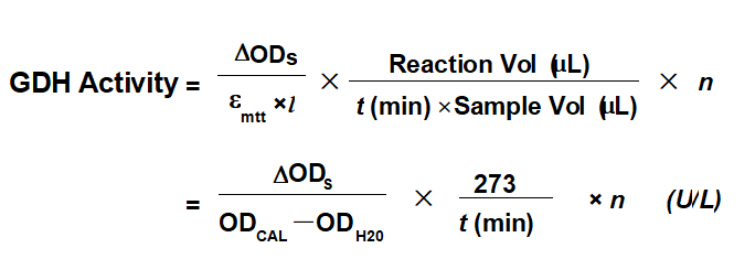 从每个样品的OD15中减去OD0来计算DODS值。然后,GDH活性可按以下方式计算:
