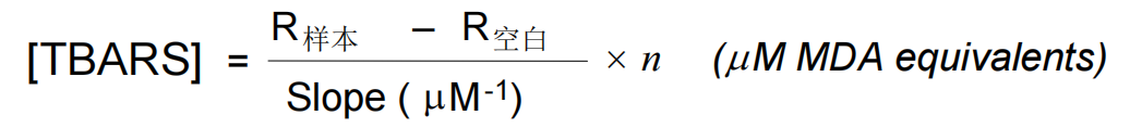 所有标准品和样品吸光值减去空白对照的吸光值或荧光强度,对标准浓度作图并确定标准曲线的斜率(Slope),计算样品TBARS的浓度: