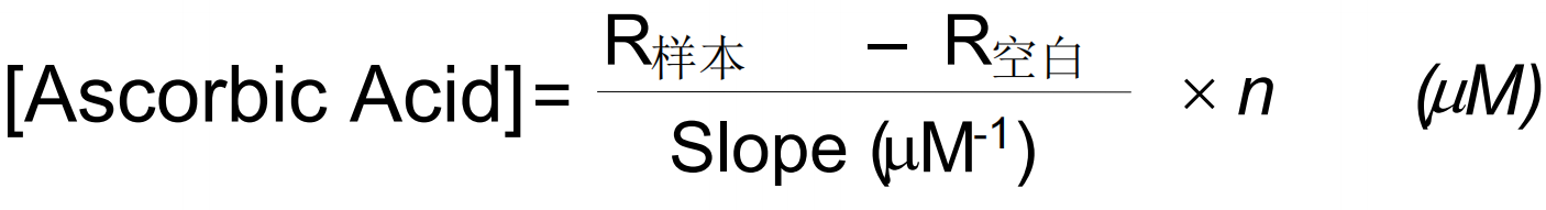 注意:如果计算出的样品中抗坏血酸浓度大于 1000 mM(比色检测)或100 mM(荧光检测),则用水稀释样品后再次检测,用稀释系数n 乘以结果。