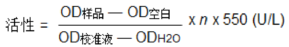 OD样品 和OD空白 分别是样品和空白的OD595nm 值,OD校准液 和 ODH2O 分别是校准液和水的OD595nm值。n 是稀释系数,“550” 是校准液在测试环境下的等效活性(U/L)。