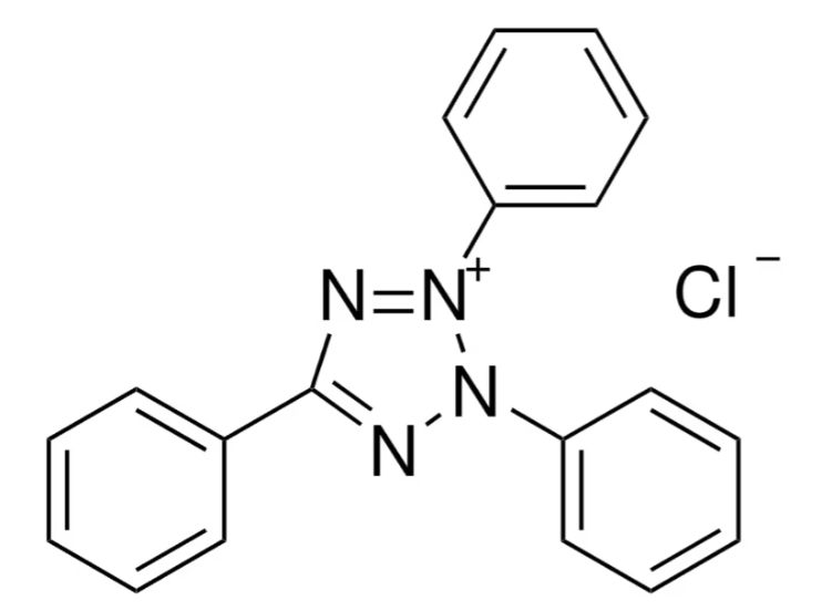 2,3,5-氯化三苯基四氮唑,又称四唑红,简称TTC,TTZ,或TPTZ,一种脂溶性光敏感复合物,既可用来检测种子的生存能力,也可用来检测哺乳动物组织的缺血梗塞。检测机制在于TTC本身可作为一种氧化还原指示剂,活细胞内的脱氢酶(尤其是线粒体内的琥珀酸脱氢酶)可以将TTC还原为红色甲臢化合物TPF(1,3,5-triphenylformazan)。对于种子或者植物组织来说,染色结果为活组织被染成不同程度的红色,死组织或者无生命力的组织不着色。对于缺血梗塞组织,因组织坏死脱氢酶活力丧失呈现苍白色,而正常组织呈深红色。TTC常用的染色浓度为2%(w/v),也可根据组织类型做浓度的适当调整。
