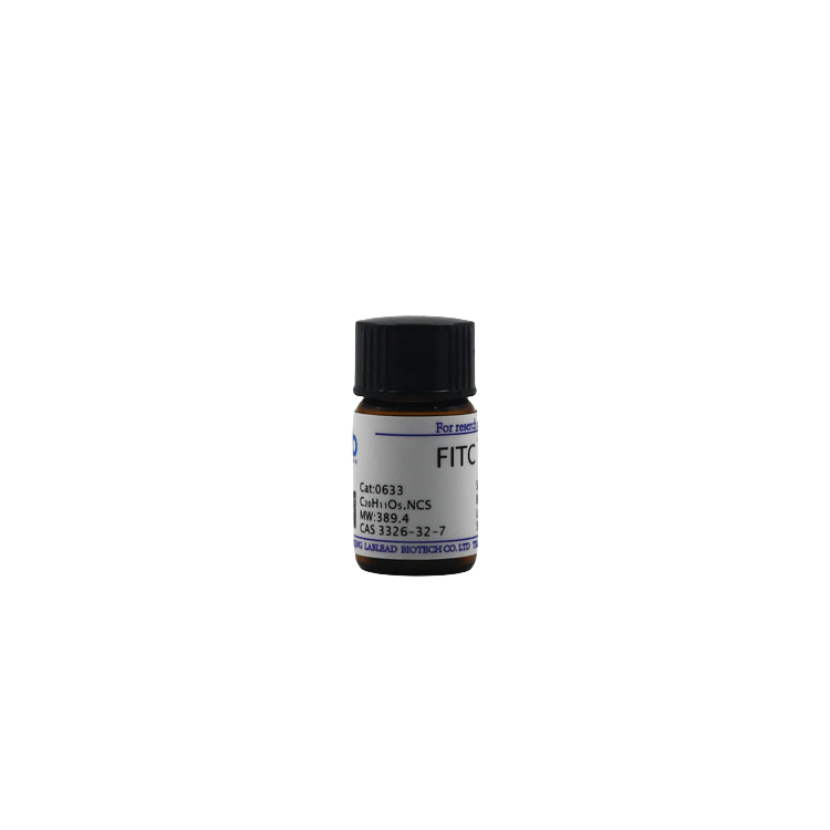 FITC,英文全称Fluorescein Isothiocyanate,中文名称异硫氰酸荧光素,具有高吸收率、优良的荧光量子产率和良好的水溶性等特点,是生物学中应用最为广泛的一种绿色荧光素衍生物,其异硫氰酸基团可与蛋白的氨基末端或者伯胺反应从而实现包括抗体,凝集素在内的蛋白标记。