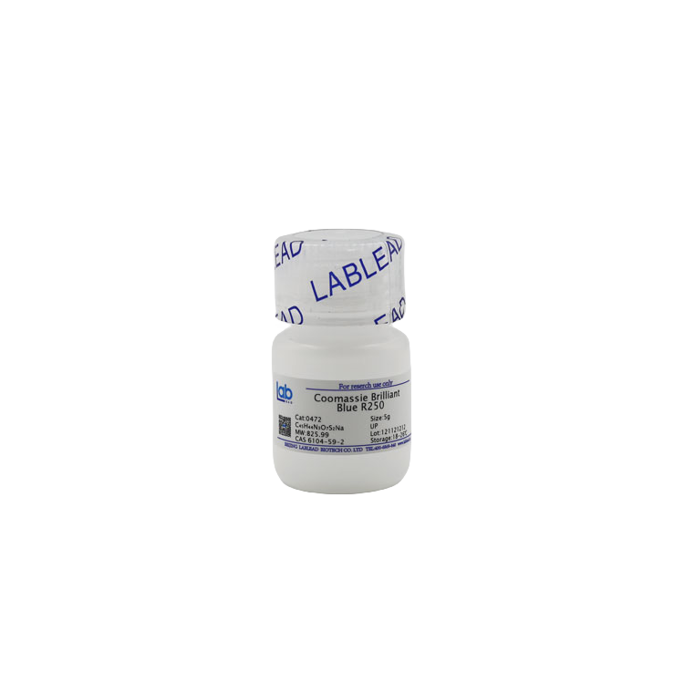 考马斯亮蓝(Coomassie brilliant blue)是两种相似三苯甲烷染料的总称,有 G250 和 R250 两种,结构上前者比后者多 了 2 个甲基,命名上“G”为 Green 的缩写,因 G250 的蓝色染料泛浅绿色;命名上“R”为 Red 的缩写,因 R250 的蓝色染料呈 微红色调;“250”表示考马斯亮蓝的纯度。生化实验中常将考马斯亮蓝用于蛋白定量和蛋白电泳中蛋白染色。工作原理是: 通过与蛋白质内的氨基和羧基基团间的静电结合作用以及范德华力,考马斯亮蓝与蛋白质形成强但非共价键连接的复合物。 蛋白-染料复合物的形成稳定染料携带的负电荷阴离子(如磺酸基),从而产生在膜上或者胶上肉眼可见的蓝色。 考马斯亮蓝 R250(Coomassie brilliant blue R250)更多用于电泳蛋白的染色,染色灵敏度比氨基黑高 5 倍,可达 0.1 µg 蛋白。R250 染色后需要褪色,才能进行蛋白条带的观察。 考马斯亮蓝 G250 的检测灵敏度虽然较低,但也可替代 R250,使用一种快速而简单的方法进行蛋白染色。因其具有以 下特性,即在低于 pH 2.0 时,溶液无色;pH 7.0 时溶液呈深蓝黑色;若发生酸化,溶液呈现透明的棕褐色。当 G250 与蛋白 结合,溶液又回到蓝色,主要因为蛋白分子周围具有更偏中性的 pH 环境。合适条件下,当把胶放在酸化的 G250 溶液中染 色,显示出蓝色的蛋白条带,背景呈浅琥珀色。此种方法条带快速显色,且背景颜色也很浅使得条带看起来很清楚,则不需 要做褪色处理。大部分蛋白用 G250 检测的下限是 0.5 µg。虽然灵敏度降低,取而代之的是操作快速以及方便,比 R250 染 色节省高达 11 h。