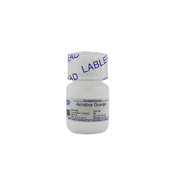 吖啶橙:3,6-(二甲胺基)吖啶盐酸盐,分子式C17H19N3 · HCl · ZnCl₂, 分子量438.12g/mol,吖啶橙是一种荧光色素,其检测激发滤光片波长488nm,阻断滤光片波长515nm。它与细胞中DNA和RNA结合量存在差别,可发出不同颜色的荧光,与DNA结合量少发绿色荧光,与RNA结合量多发桔黄色或桔红色荧光。该染料具有膜通透性,能透过细胞膜,使核DNA和RNA染色。因此,在荧光显微镜下观察,吖啶橙可透过正常细胞膜,使细胞核呈绿色或黄绿色均匀荧光;而在凋亡细胞中,因染色质固缩或断裂为大小不等的片断,形成凋亡小体。吖啶橙使其染上致密浓染的黄绿色荧光,或黄绿色碎片颗粒;而坏死细胞黄荧光减弱甚至消失。吖啶橙AO常与溴化乙啶EB合用双染,因EB只染死细胞使之产生桔黄色荧光,由此可区分出正常细胞、凋亡细胞及坏死细胞.它还可以用作移码突变的诱变剂,能镶嵌于两个相邻的碱基对之间,这样在DNA复制过程中,会使DNA链增加或缺失一个碱基,造成移码突变。吖啶橙染液有毒,操作时要戴手套,需避光。