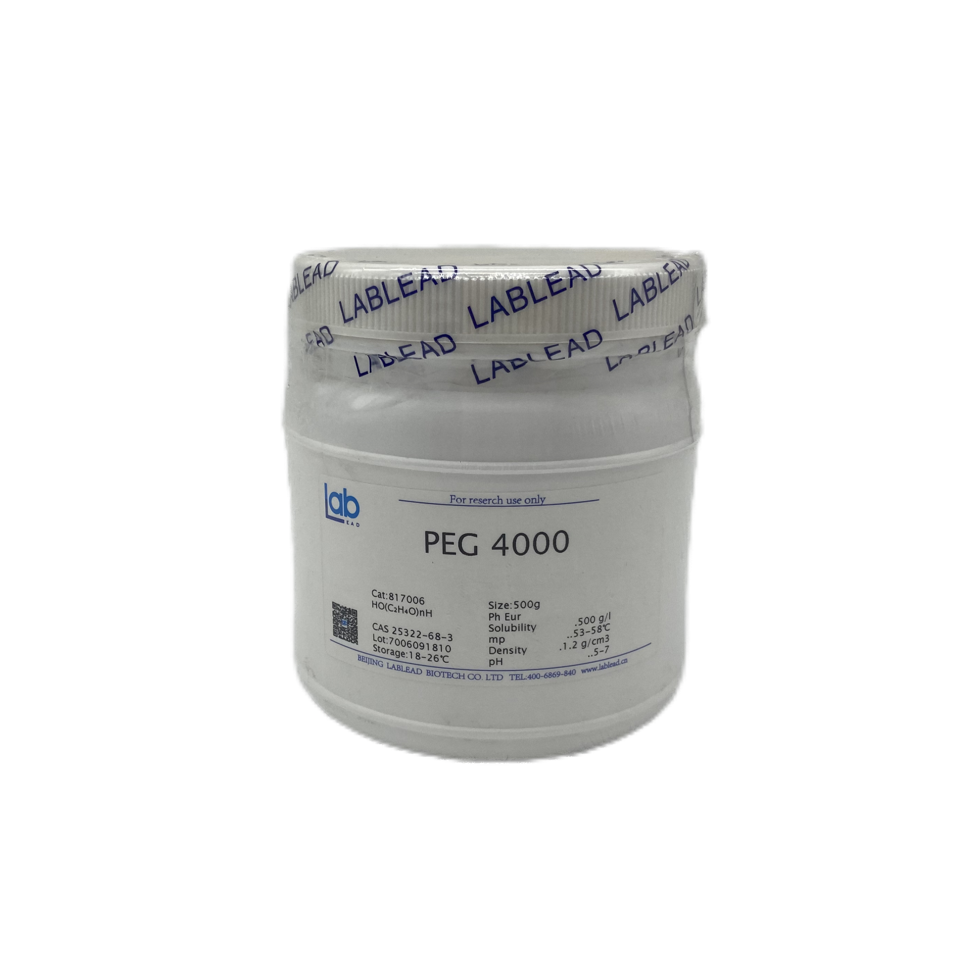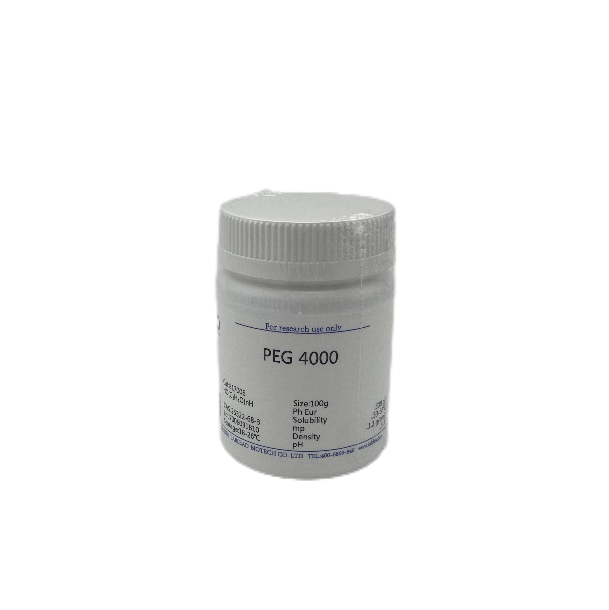 Polyethylene Glycol 4000(PEG 4000)是平均分子量约为4000的聚乙二醇,溶于水、以及许多极性溶剂如丙酮、乙醇和氯化溶剂等。PEG水溶液室温稳定,初次使用建议用0.45μm的滤膜对其进行过滤除杂。单克隆抗体制备过程中,常加入PEG 4000以促进骨髓瘤细胞和脾脏细胞的融合以得到杂交瘤细胞。