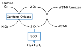 目前测定SOD比较先进的方法包括WST-1法和WST-8法,其中WST-8法比WST-1法更加稳定、灵敏度更高。本试剂盒采用了目前测定SOD方法中稳定性更好、灵敏度更高的WST-8法,可以检测出低达0.5U/ml的超氧化物歧化酶。WST-8法的原理参考图1,WST-8可以和黄嘌呤氧化酶(Xanthine Oxidase, XO)催化产生的超氧化物阴离子(O2.-)反应产生水溶性的甲臜染料(formazan dye),由于SOD能催化超氧化物阴离子发生歧化作用,所以该反应步骤可以被SOD所抑制,因此SOD的活性与甲臜染料的生成量成负相关,从而通过对WST-8产物的比色分析即可计算SOD的酶活力。